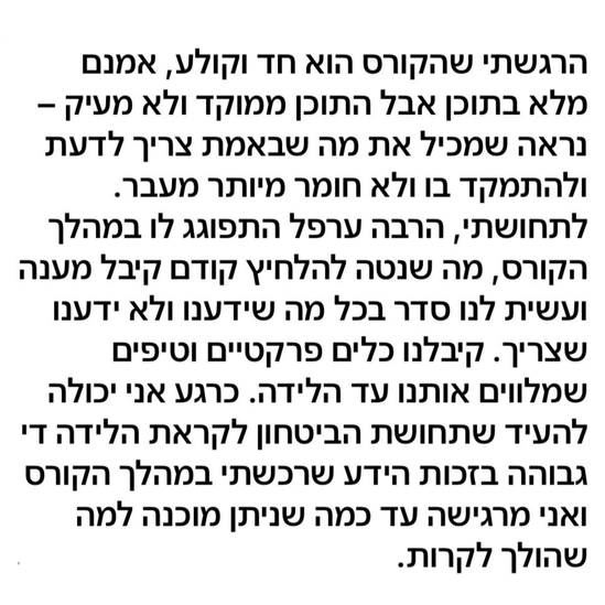 הקורס יעזור לך להבין לקראת מה את הולכת! מה את הולכת להרגיש, מה צריך לעשות בכל שלב, ואיך הולך להראות התהליך עם ההגעה לבית החולים