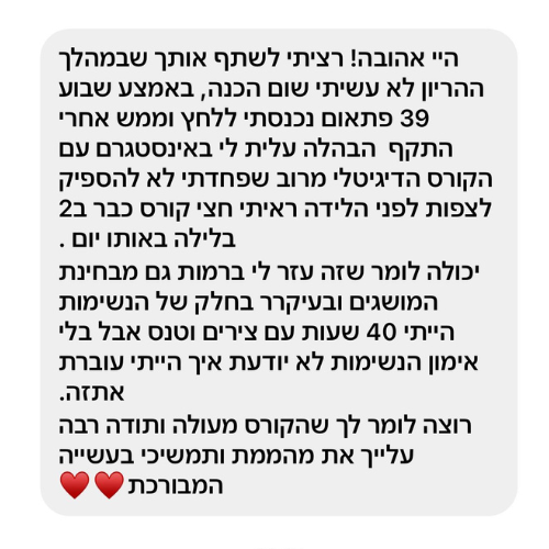 הקורס הדיגיטלי נשלח אליכם למייל מיד לאחר התשלום לצפייה מתי ואיפה שנוח לכם!